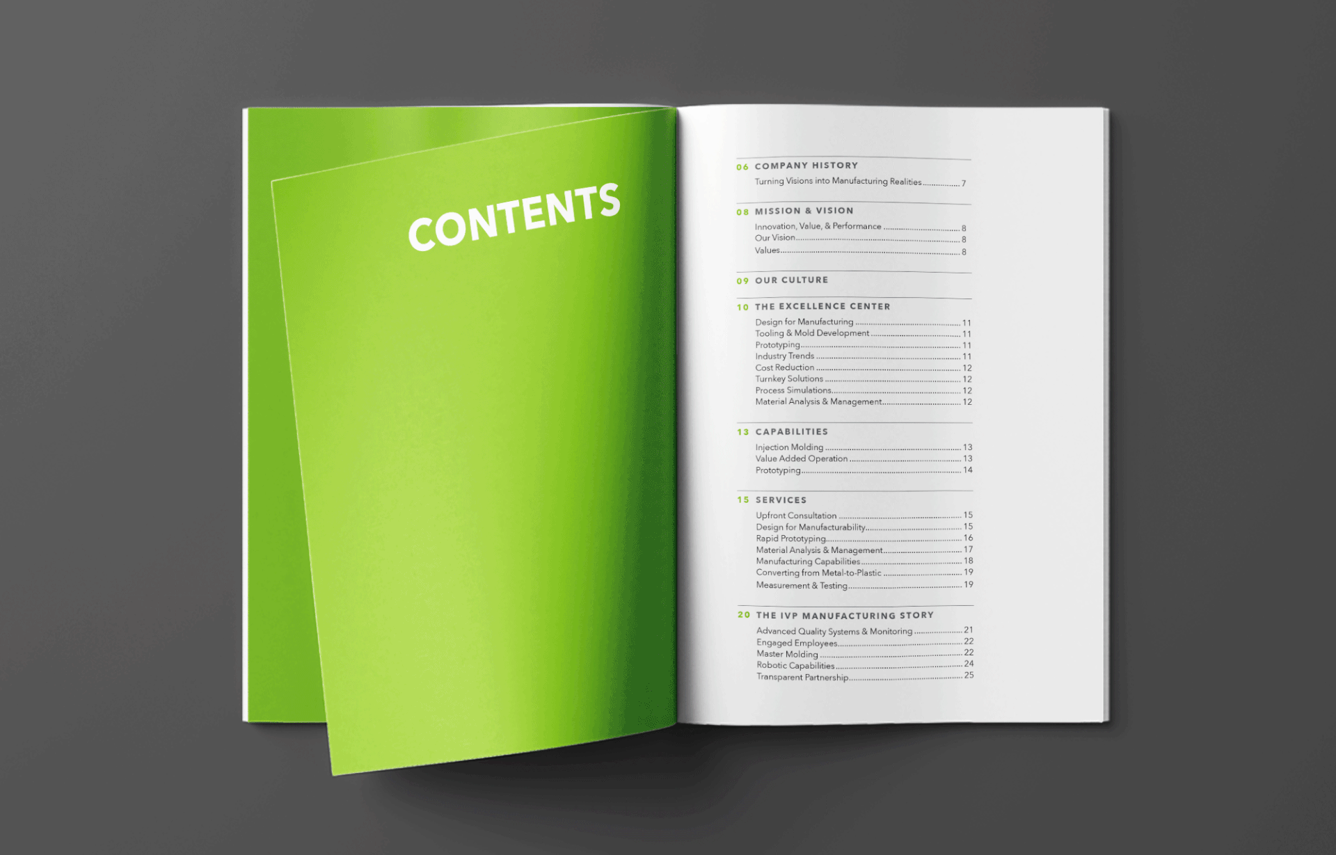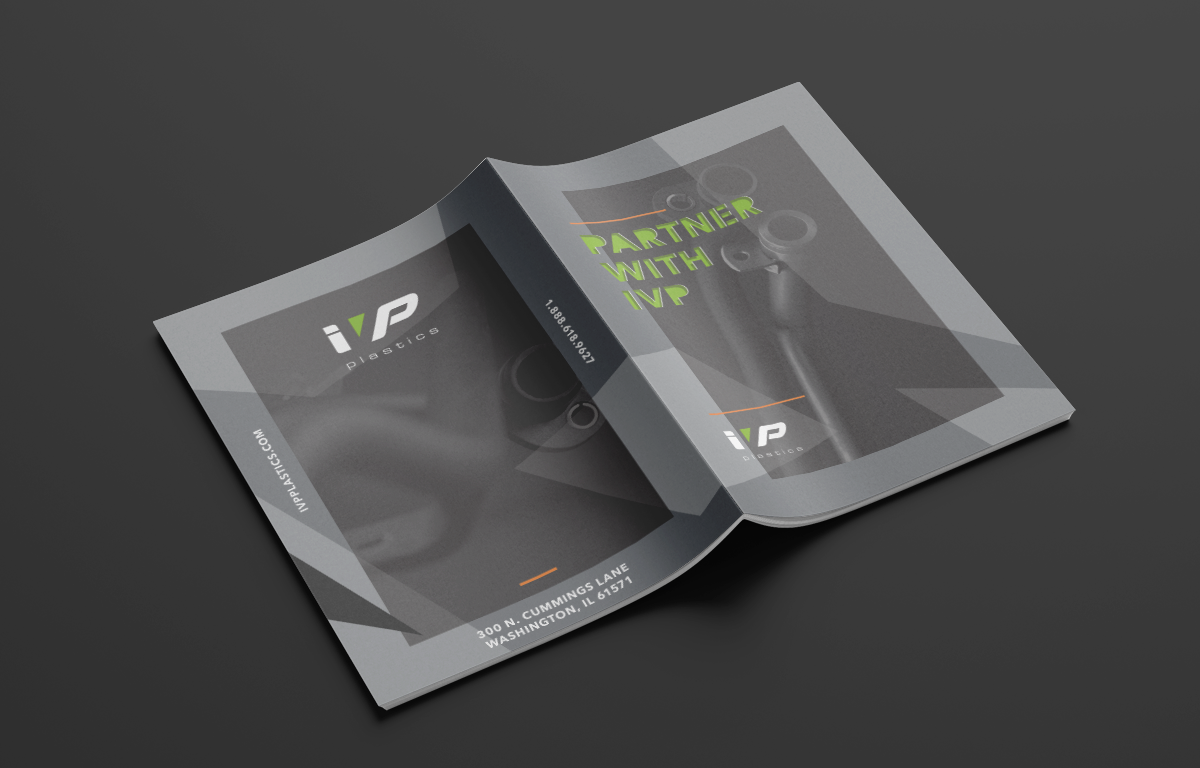 The purpose of this booklet is to reach out to certain companies to partner with a plastics manufacturing company called IVP Plastics. Die-cut lettering on the cover and pages made of plastic, tear-proof paper resemble IVP's range of capabilities and robustness.